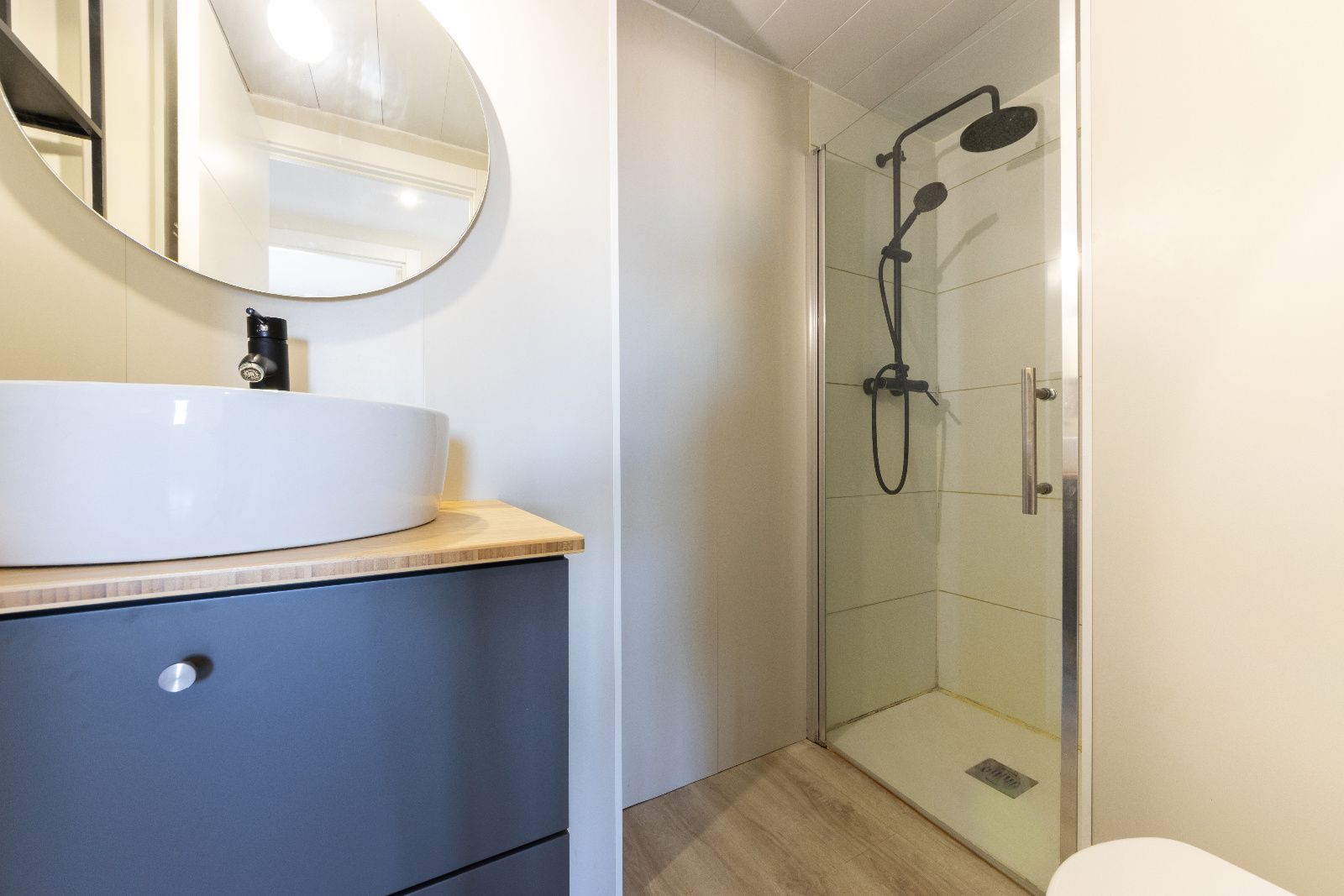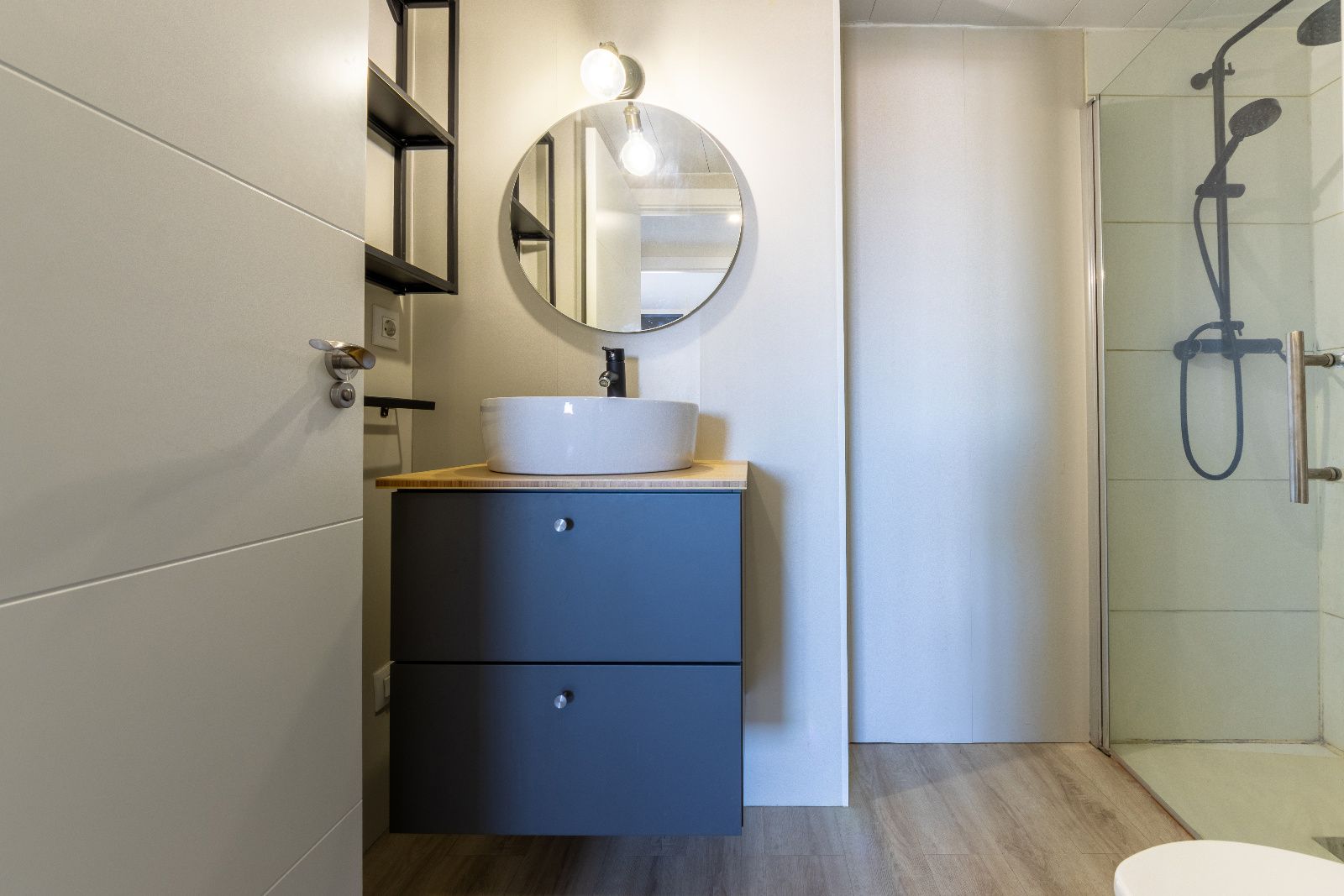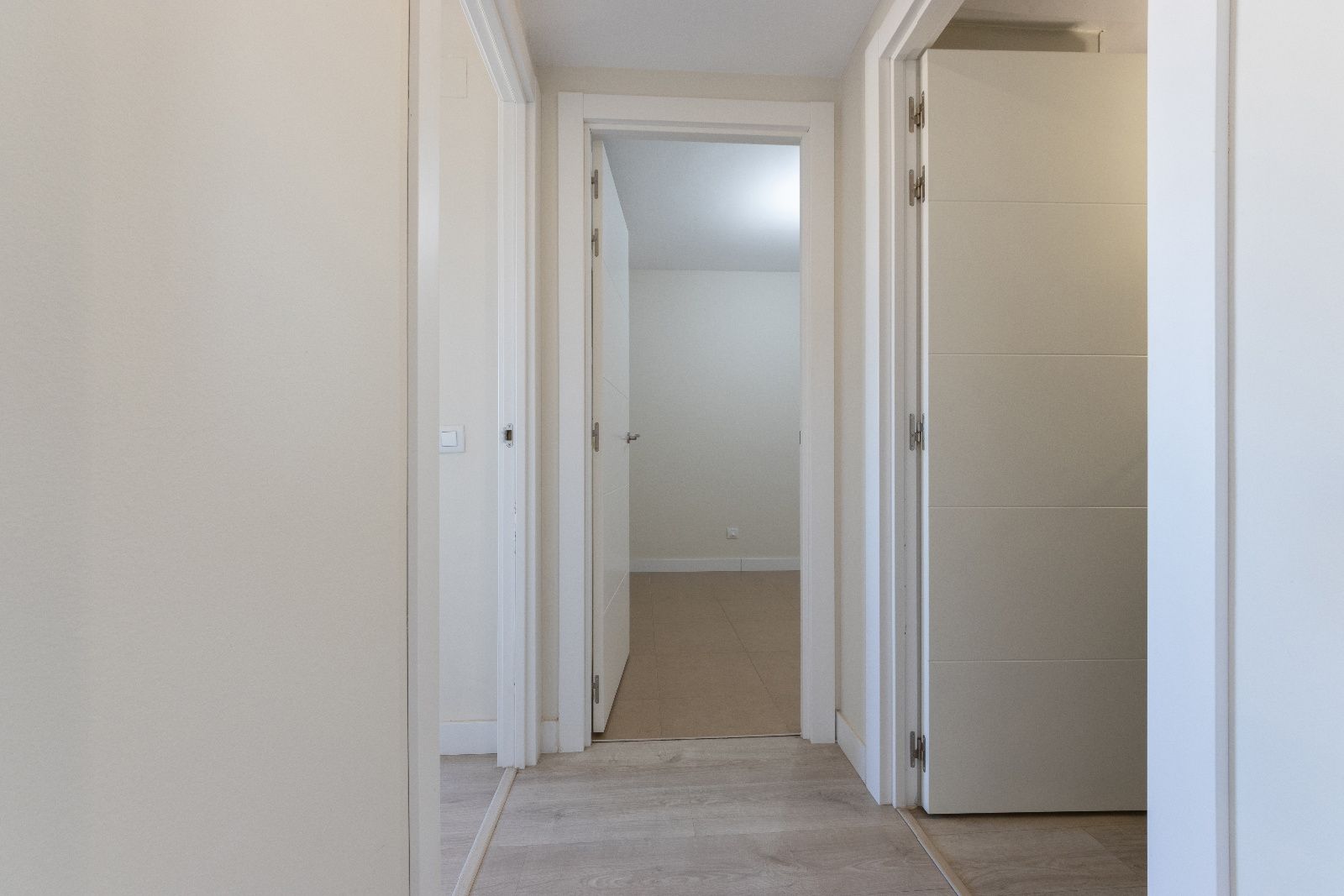 El baño moderno aporta elegancia y funcionalidad, mientras que las puertas lacadas en blanco y el parquet de haya claro crean un ambiente cálido y sofisticado. La carpintería exterior de aluminio garantiza calidad y durabilidad.