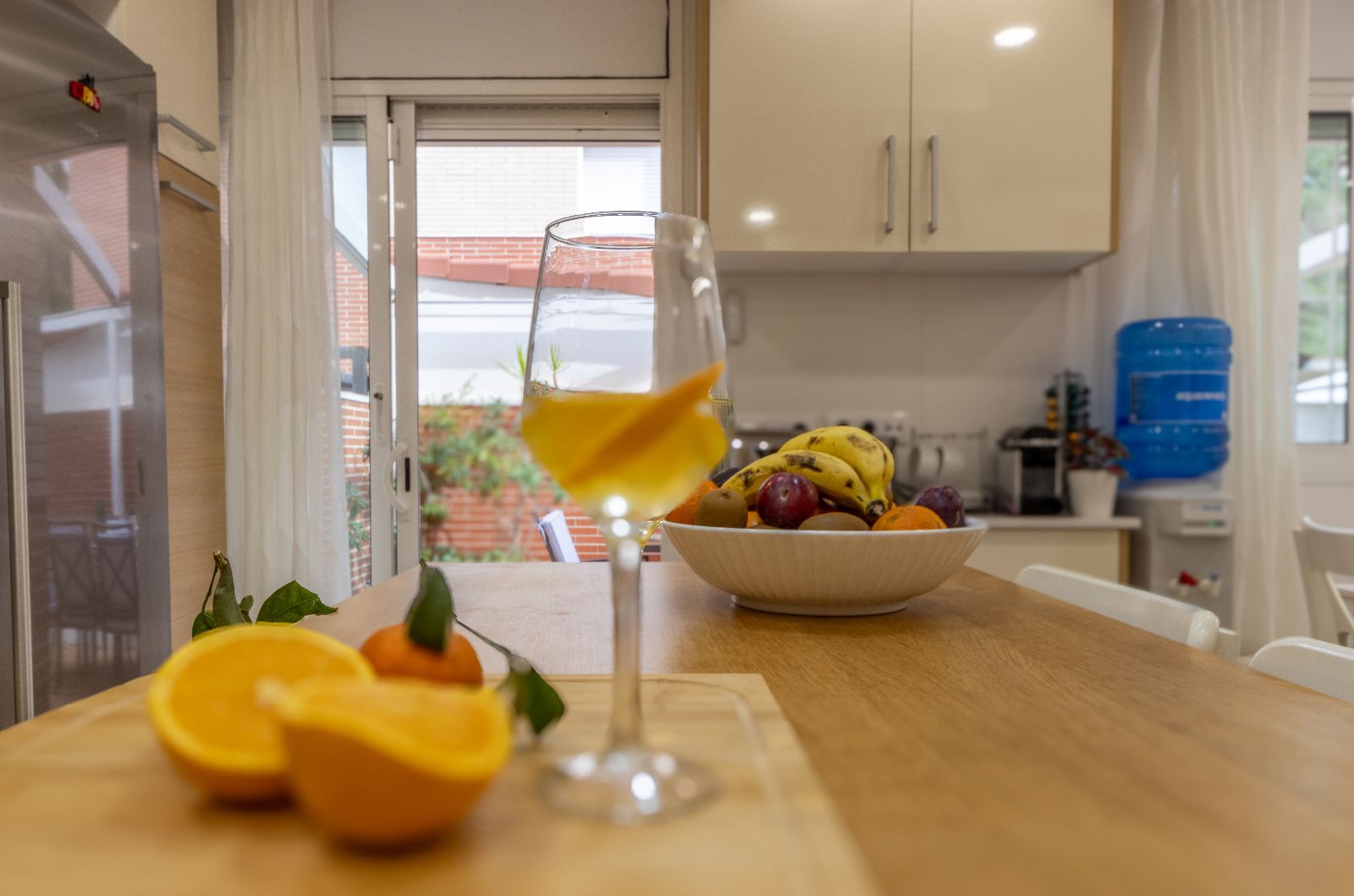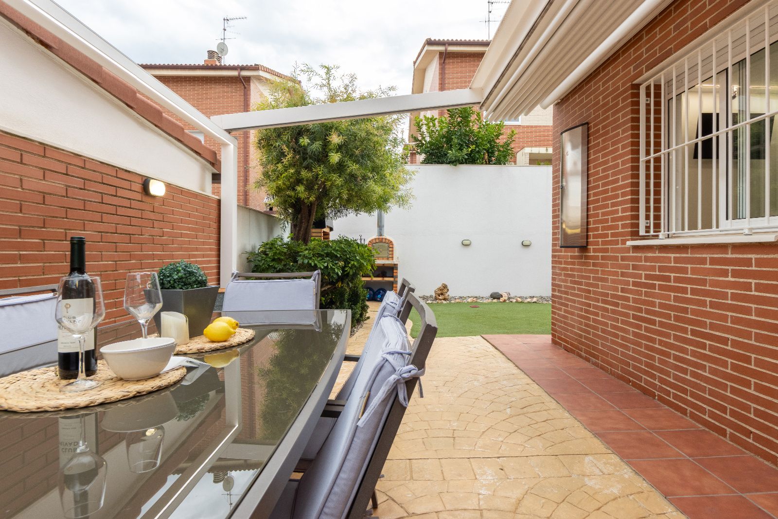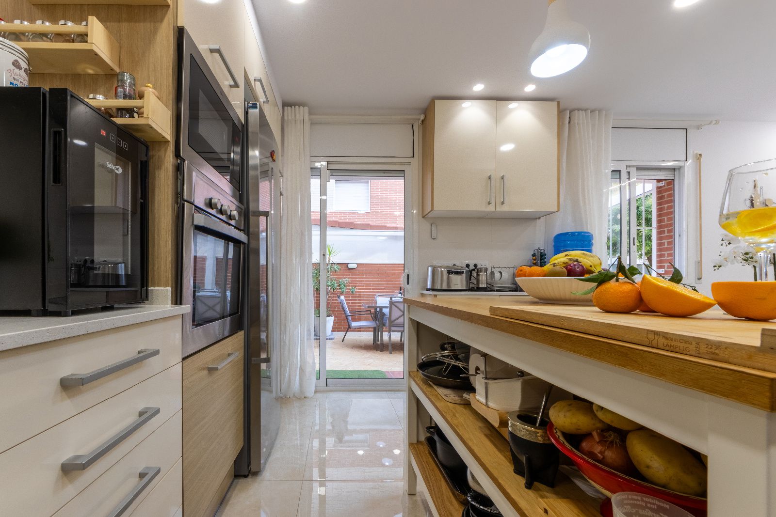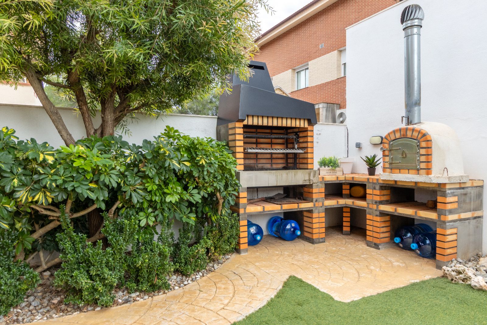La cocina tipo office, reformada y excelentemente equipada, es una pieza destacada: funcional, con amplias superficies de trabajo y con acceso directo al jardín posterior, donde se ubica un espacio, cubierto con un gran toldo mecanizado accionado por control remoto y domótica, a través del teléfono móvil. A continuación, encontramos la zona de barbacoa y el horno de piedra, ideal para encuentros y celebraciones al aire libre. 🔥 En la planta baja también se encuentra un baño completo de uso cotidiano.