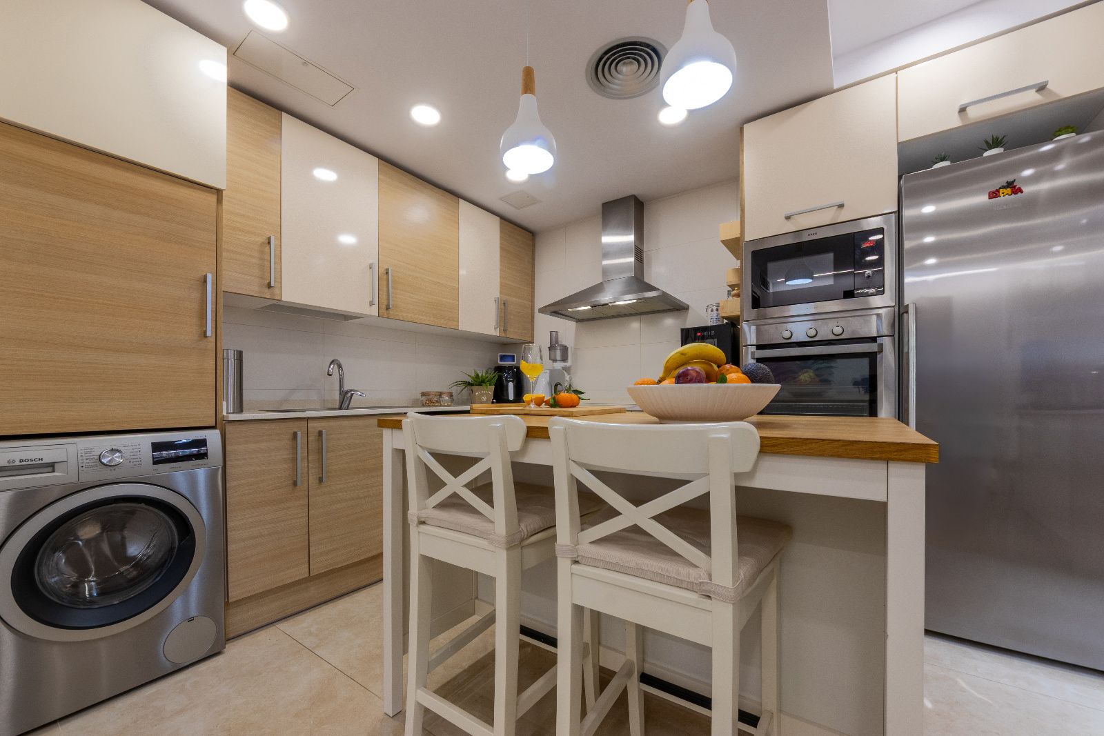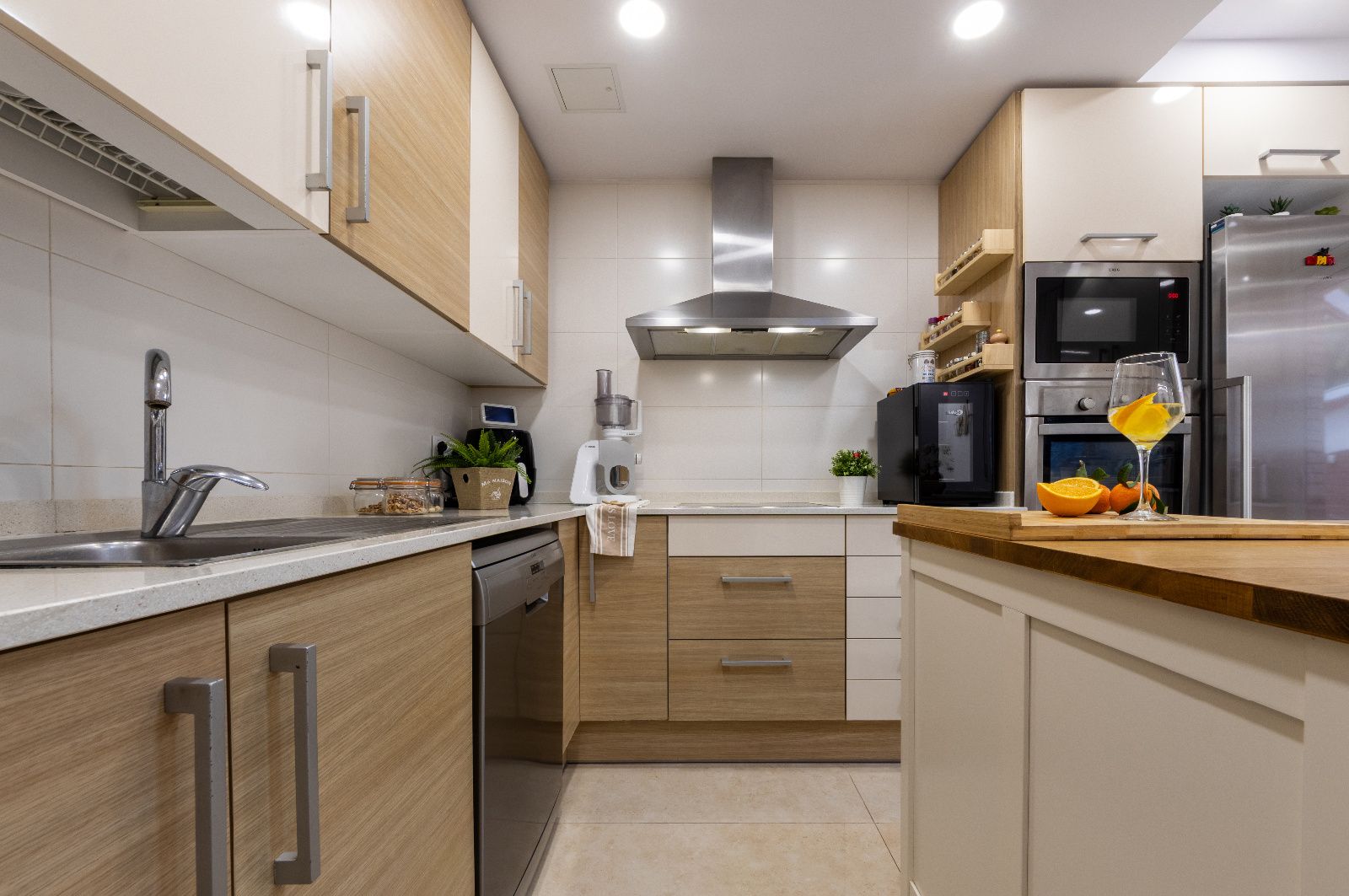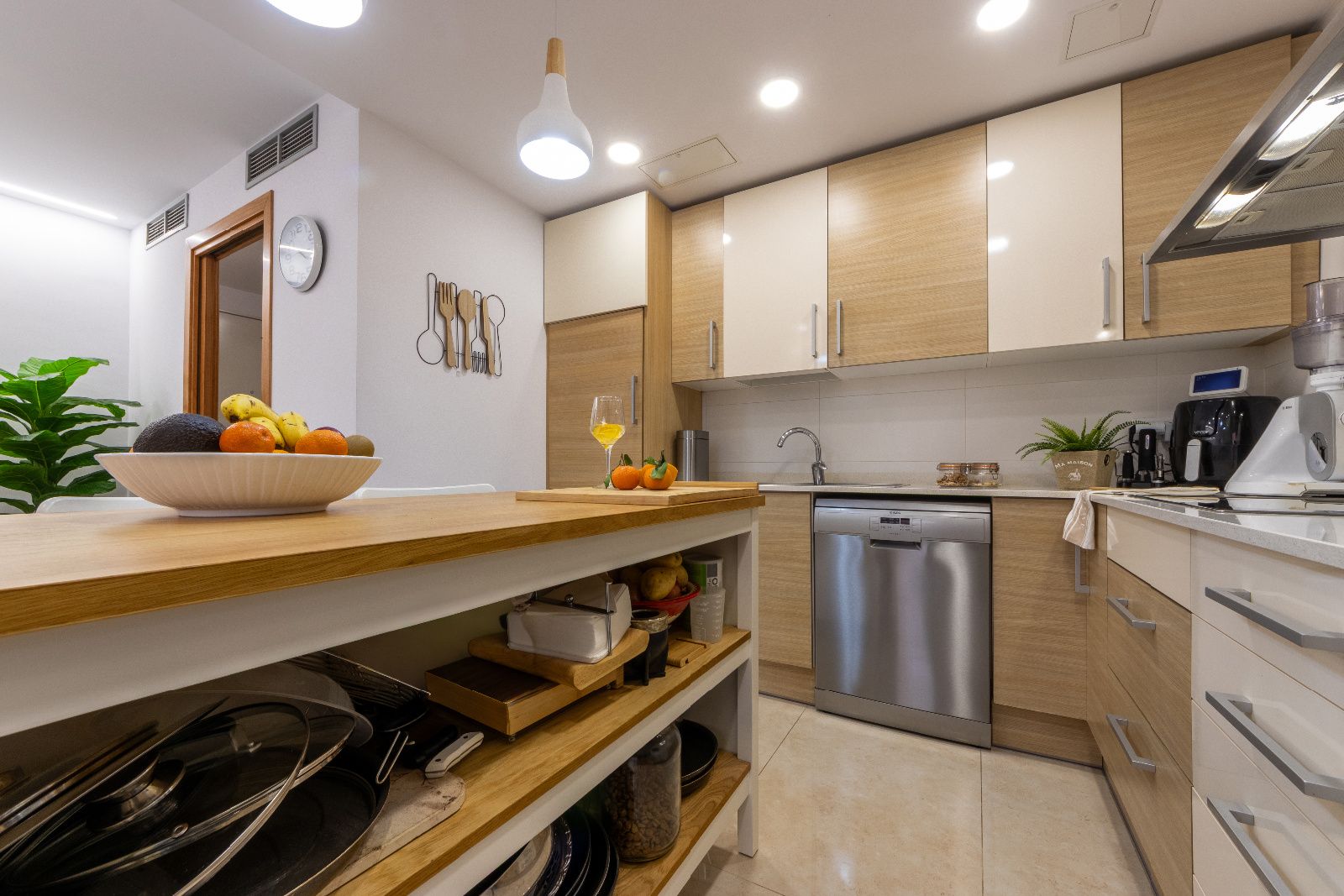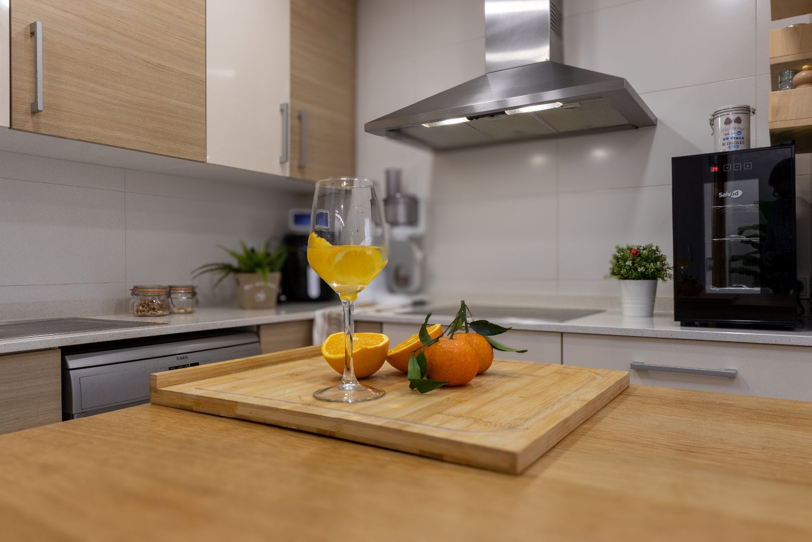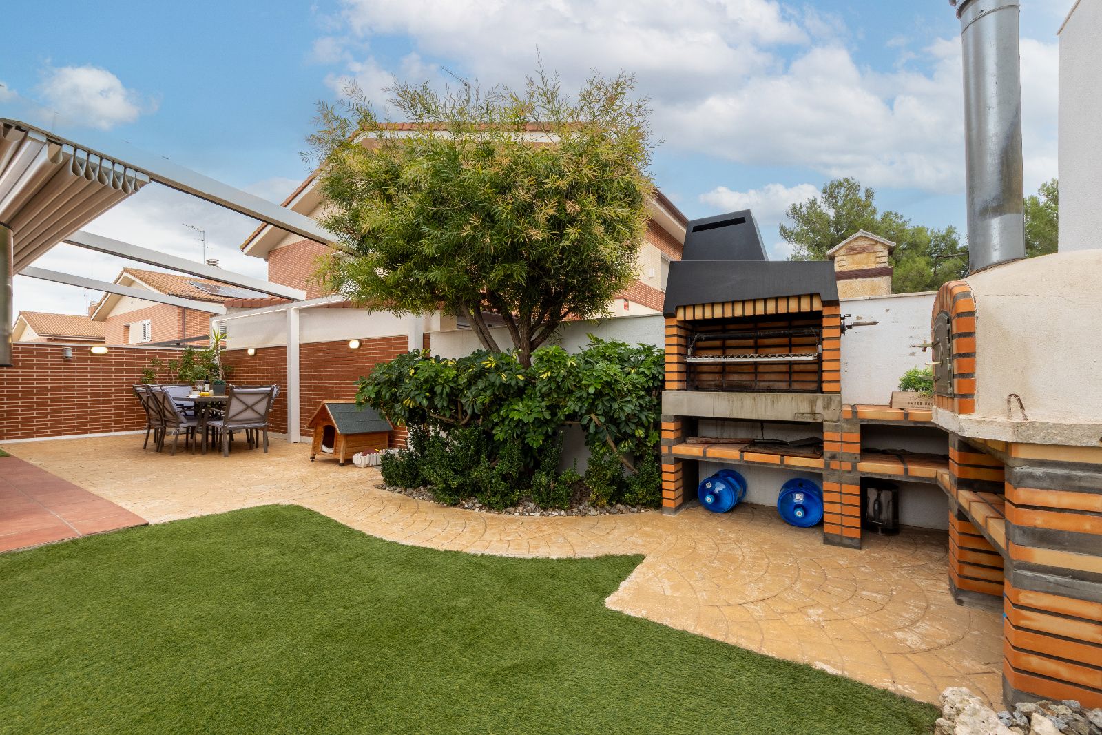 La cocina tipo office, reformada y excelentemente equipada, es una pieza destacada: funcional, con amplias superficies de trabajo y con acceso directo al jardín posterior, donde se ubica un espacio, cubierto con un gran toldo mecanizado accionado por control remoto y domótica, a través del teléfono móvil. A continuación, encontramos la zona de barbacoa y el horno de piedra, ideal para encuentros y celebraciones al aire libre. 🔥 En la planta baja también se encuentra un baño completo de uso cotidiano.